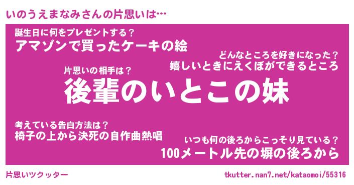| 胡散臭い通販商品みたいなあだ名 | 『モテモテ間違いなし霊験あらたかなお札…その名も「いのうえまなみ」』 |
