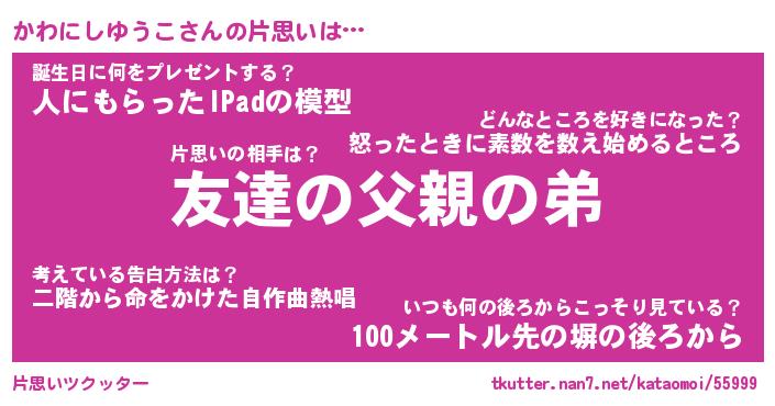 | 胡散臭い通販商品みたいなあだ名 | 『億万長者になれるブレスレット…その名も「かわにしゆうこ」』 |