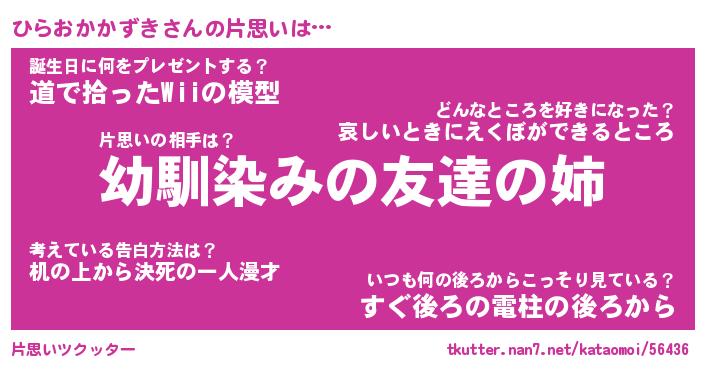| 女子向けラノベタイトル風あだ名 | 『(仮)ひらおかかずきのやんごとなき事情』 |