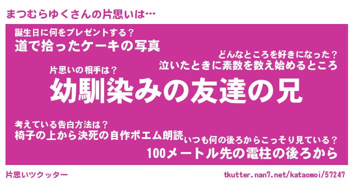 | 男性向けラノベタイトル風あだ名 | 『まつむらゆくの憂鬱』 |
