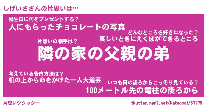 | 胡散臭い通販商品みたいなあだ名 | 『モテモテ間違いなし水晶球…その名も「しげいさ」』 |