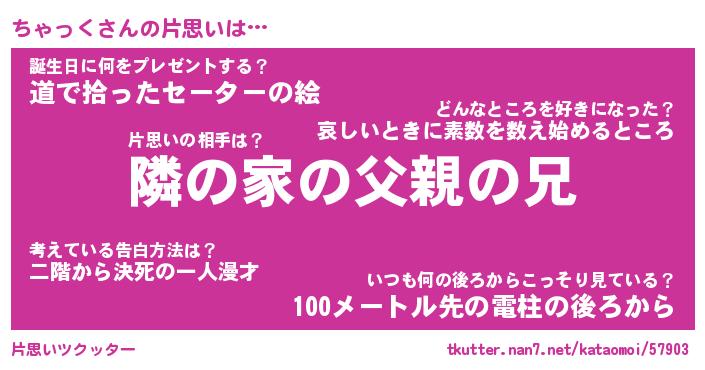 | 男性向けラノベタイトル風あだ名 | 『ちゃっくの憂鬱』 |