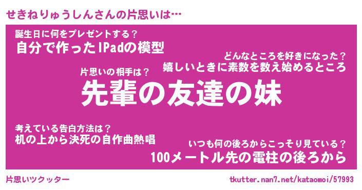 | 男性向けラノベタイトル風あだ名 | 『せきねりゅうしんの憂鬱』 |