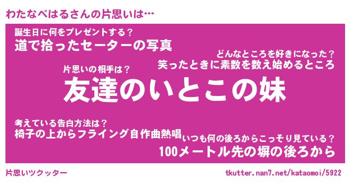 | 伝説のあだ名 | 『封印されしスナイパーわたなべはる』 |