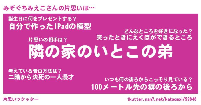 | 女子向けラノベタイトル風あだ名 | 『(仮)みぞぐちみえこのやんごとなき事情』 |