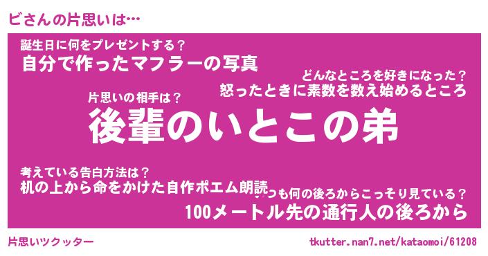 | ヘコむあだ名 | 『ビにゅー』『つくし』『ビっ子』 |