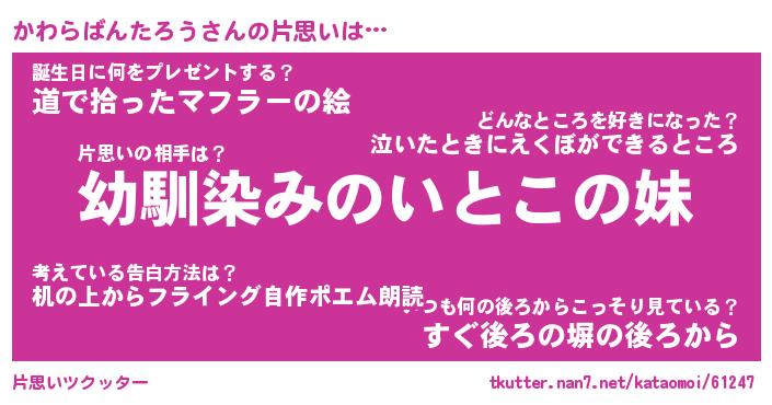 | 男性向けラノベタイトル風あだ名 | 『かわらばんたろうの憂鬱』 |