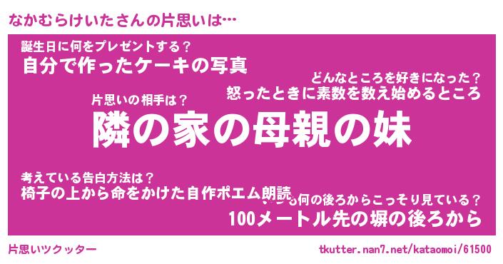 | 男性向けラノベタイトル風あだ名 | 『なかむらけいたの憂鬱』 |