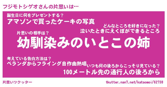 | 男性向けラノベタイトル風あだ名 | 『フジモトシゲオの憂鬱』 |