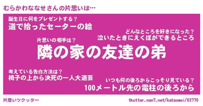 | 男性向けラノベタイトル風あだ名 | 『むらかわななせの憂鬱』 |