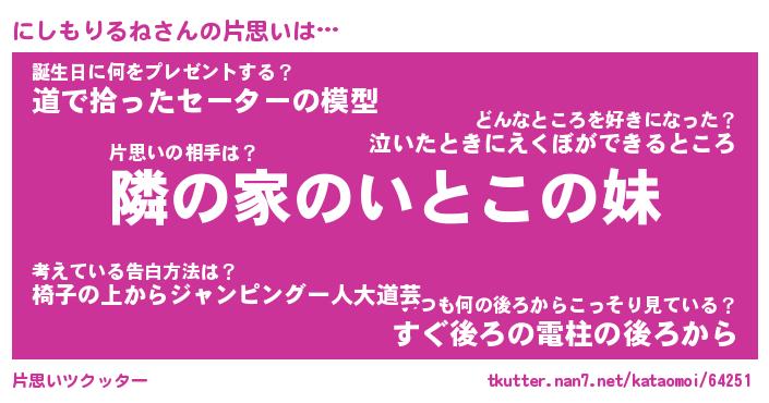 | 胡散臭い通販商品みたいなあだ名 | 『必ず成功する水晶球…その名も「にしもりるね」』 |