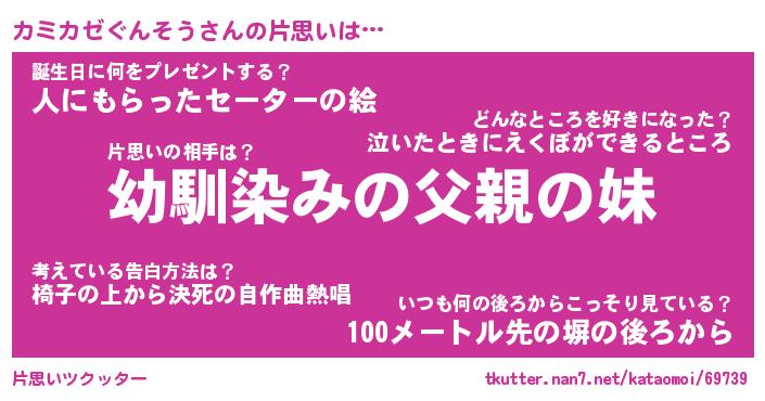 | 男性向けラノベタイトル風あだ名 | 『カミカゼぐんそうの憂鬱』 |