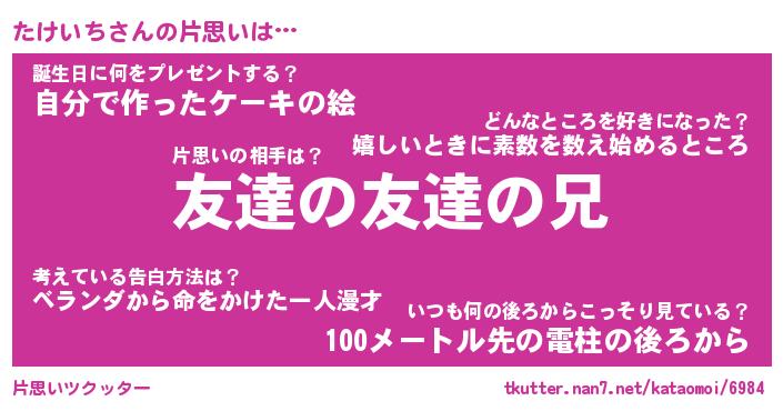 | ヘコむあだ名 | 『たけっふぃ~』『牛乳』『たけお』 |