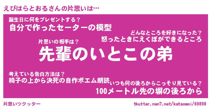 | ヘコむあだ名 | 『えびもー』『つくし』『えびぷりん』 |