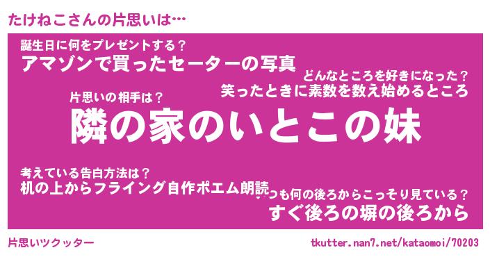| ヘコむあだ名 | 『たけもー』『なまこ酢』『たけ太郎』 |