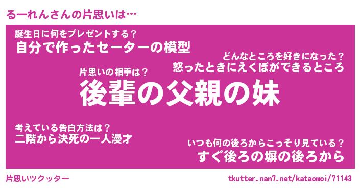 | ヘコむあだ名 | 『るーにゅー』『つくし』 |