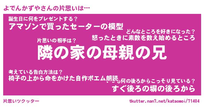 | 胡散臭い通販商品みたいなあだ名 | 『必ず成功するブレスレット…その名も「よでんかずや」』 |