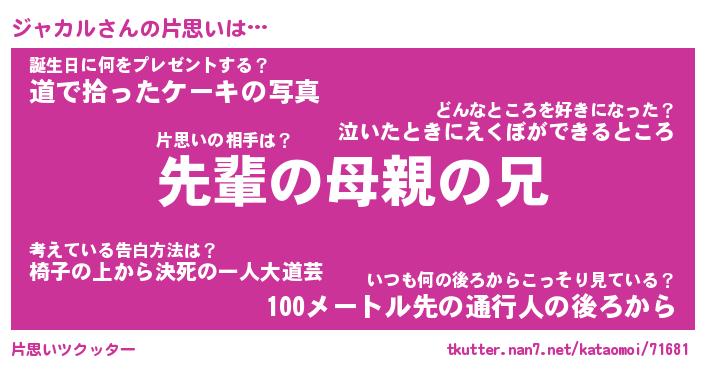 | 男性向けラノベタイトル風あだ名 | 『ジャカルの憂鬱』 |