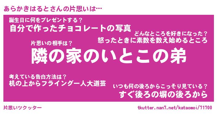 | ヒーロー風カッコイイあだ名 | 『スーパーアラカキハルト』 |