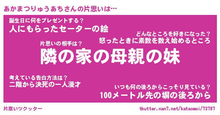 | 男性向けラノベタイトル風あだ名 | 『あかまつりゅうあちの憂鬱』 |