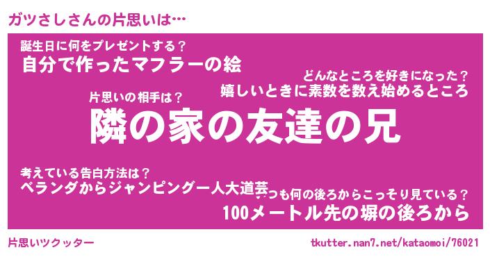 | 2回繰り返すあだ名 | 『ガツガツ』『ガガツツ』『かたかた』 |