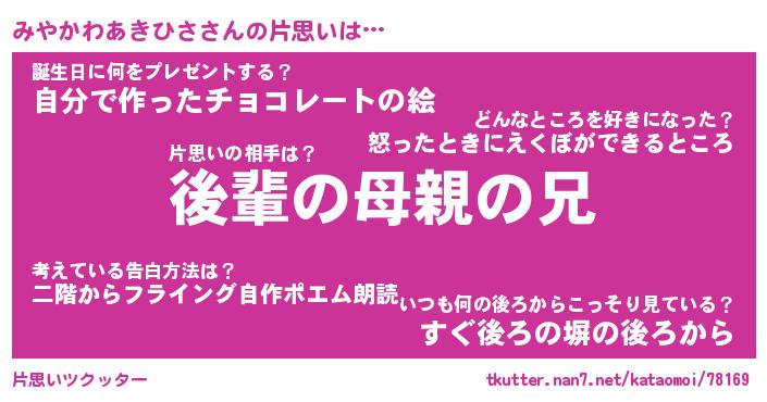 | ヘコむあだ名 | 『みやにー』『つくし』『みや太郎』 |