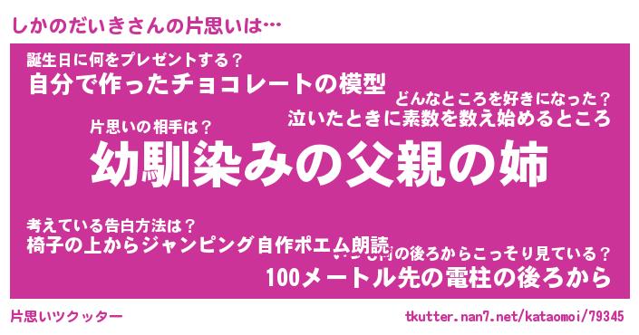 | 男性向けラノベタイトル風あだ名 | 『しかのだいきの憂鬱』 |