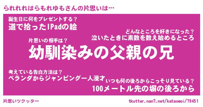| 男性向けラノベタイトル風あだ名 | 『られれれはらもれゆもの憂鬱』 |