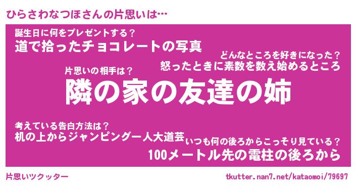 | 女子向けラノベタイトル風あだ名 | 『(仮)ひらさわなつほのやんごとなき事情』 |