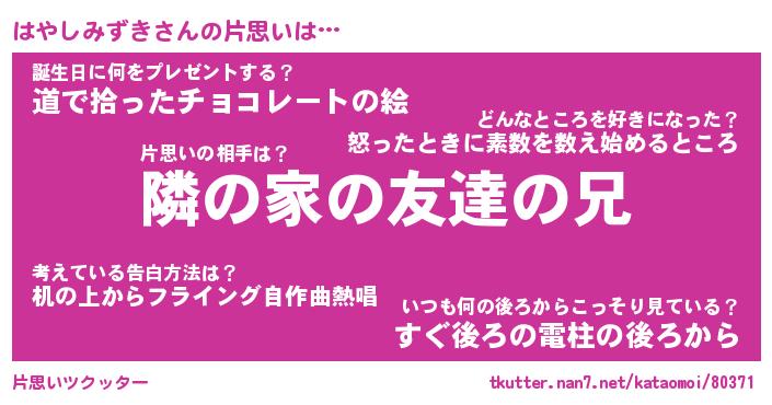 | ヒーロー風カッコイイあだ名 | 『スーパーハヤシミズキ』『魔戒騎士ハヤ』 |