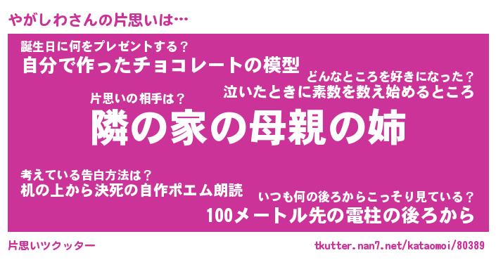 | 胡散臭い通販商品みたいなあだ名 | 『必ず成功するブレスレット…その名も「やがしわ」』 |