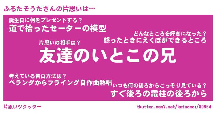 | ヒーロー風カッコイイあだ名 | 『スーパーフルタソウタ』『魔戒騎士フル』 |