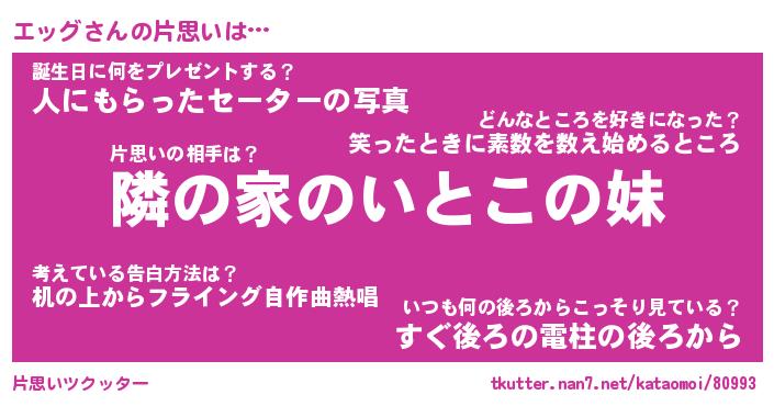 | 男性向けラノベタイトル風あだ名 | 『エッグの憂鬱』 |
