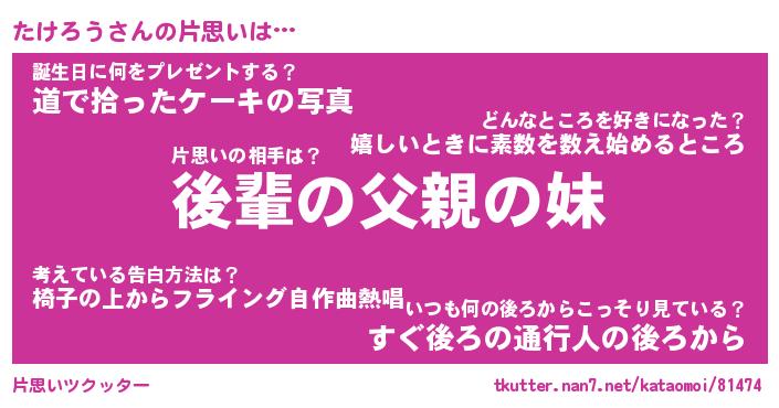 | 意味不明あだ名 | 『ペロリンたけろう』『永久保存たけろう』 |