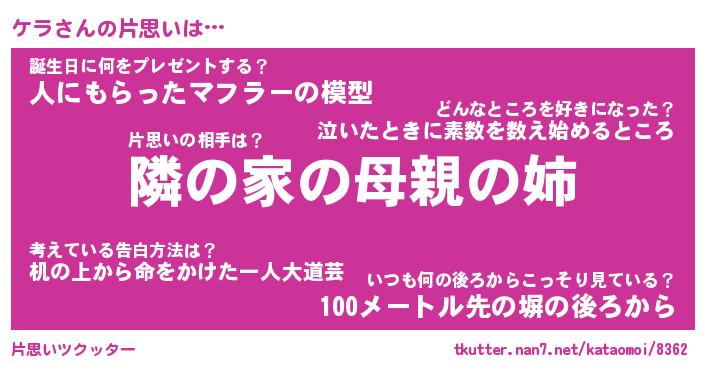 | ヘコむあだ名 | 『ケラにー』『酢こんぶ』『ケラ太郎』 |
