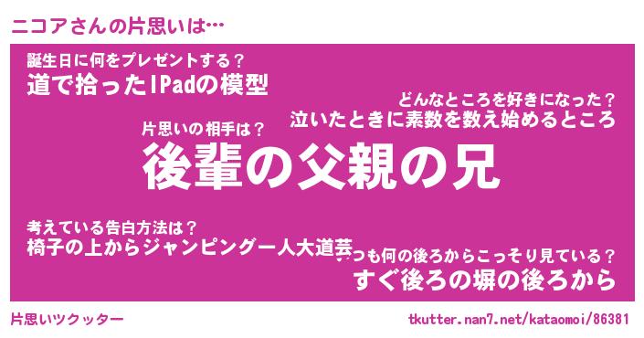 | ヘコむあだ名 | 『ニコふぇ~』『酢こんぶ』 |
