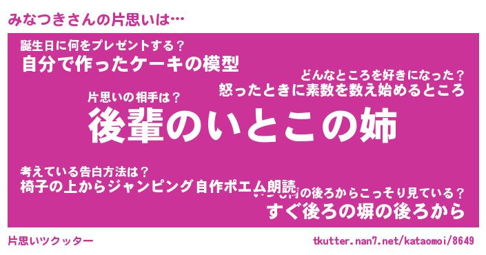 | ヘコむあだ名 | 『みなもー』『牛乳』『みな太郎』 |