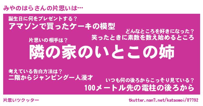 | 男性向けラノベタイトル風あだ名 | 『みやのはらの憂鬱』 |