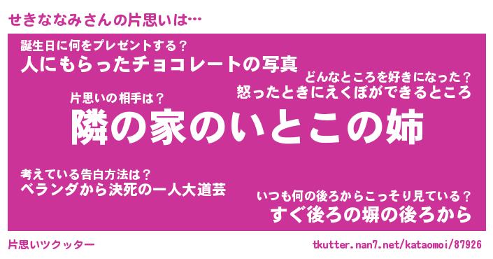 | 男性向けラノベタイトル風あだ名 | 『せきななみの憂鬱』 |