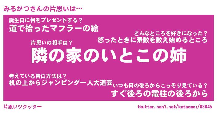 | 男性向けラノベタイトル風あだ名 | 『みるかつの憂鬱』 |