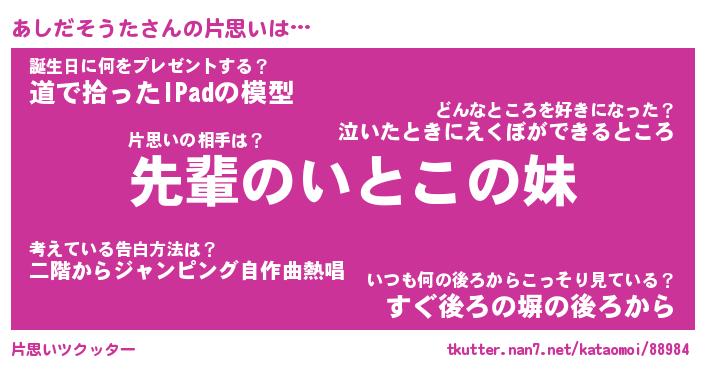 | ヒーロー風カッコイイあだ名 | 『スーパーアシダソウタ』『幻影騎士アシ』 |