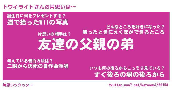 | ヒーロー風カッコイイあだ名 | 『スーパートワイライト』『魔戒騎士トワ』 |