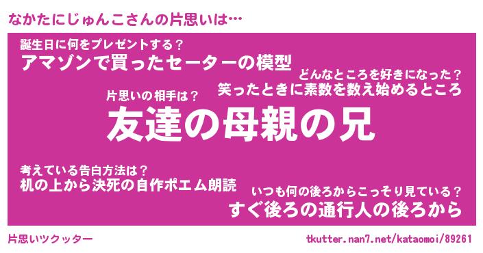 | 女子向けラノベタイトル風あだ名 | 『誰かこのなかたにじゅんこを説明してください! ~契約から始まるウェディング~』 |