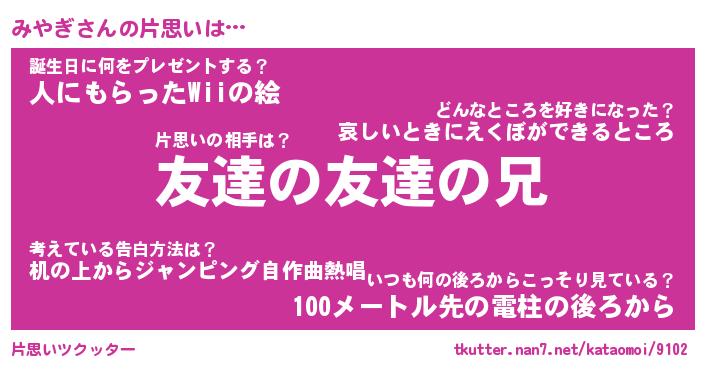| ヘコむあだ名 | 『みやもー』『レバニラ』『みやを』 |