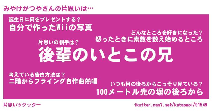 | ヒーロー風カッコイイあだ名 | 『スーパーミヤケカツヤ』『暗黒騎士ミヤ』 |
