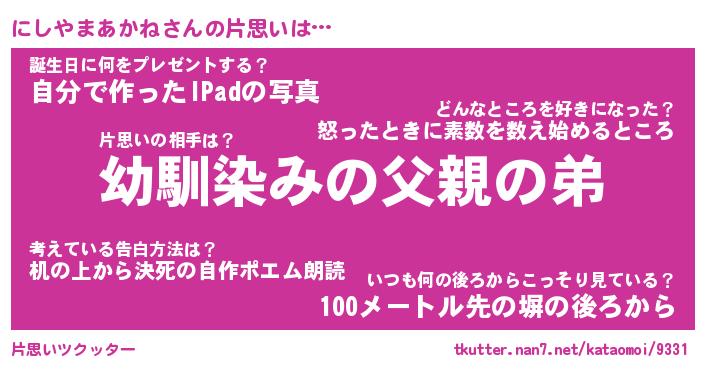| 男性向けラノベタイトル風あだ名 | 『にしやまあかねの憂鬱』 |