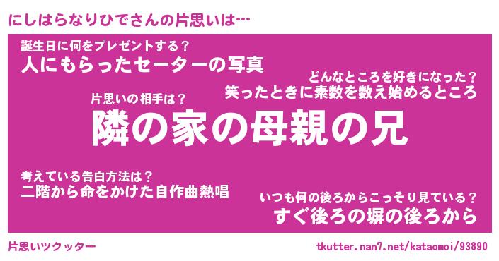 | 胡散臭い通販商品みたいなあだ名 | 『必ず成功するブレスレット…その名も「にしはらなりひで」』 |