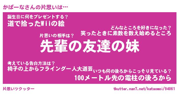 | ヘコむあだ名 | 『かぱもー』『豆乳』『かぱを』 |