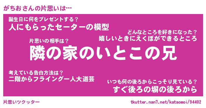 | 男性向けラノベタイトル風あだ名 | 『がちおの憂鬱』 |