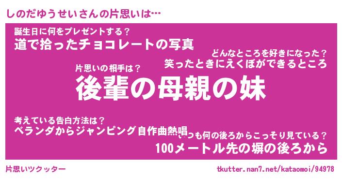 | ヘコむあだ名 | 『しのにー』『豆乳』『しのぷりん』 |